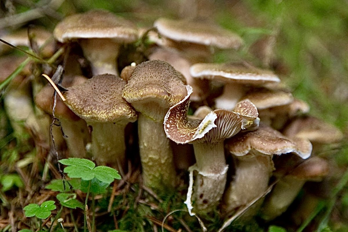 [3] Armillaria ostoyae mushrooms grow in clusters at the base of infected trees. They have orangish brown to pinkish brown caps with brown scales, finely hairy stems with a whitish ring, yellow basal mycelium, whitish gills beginning to run down the stem, and a white spore print (Kuo 2023).