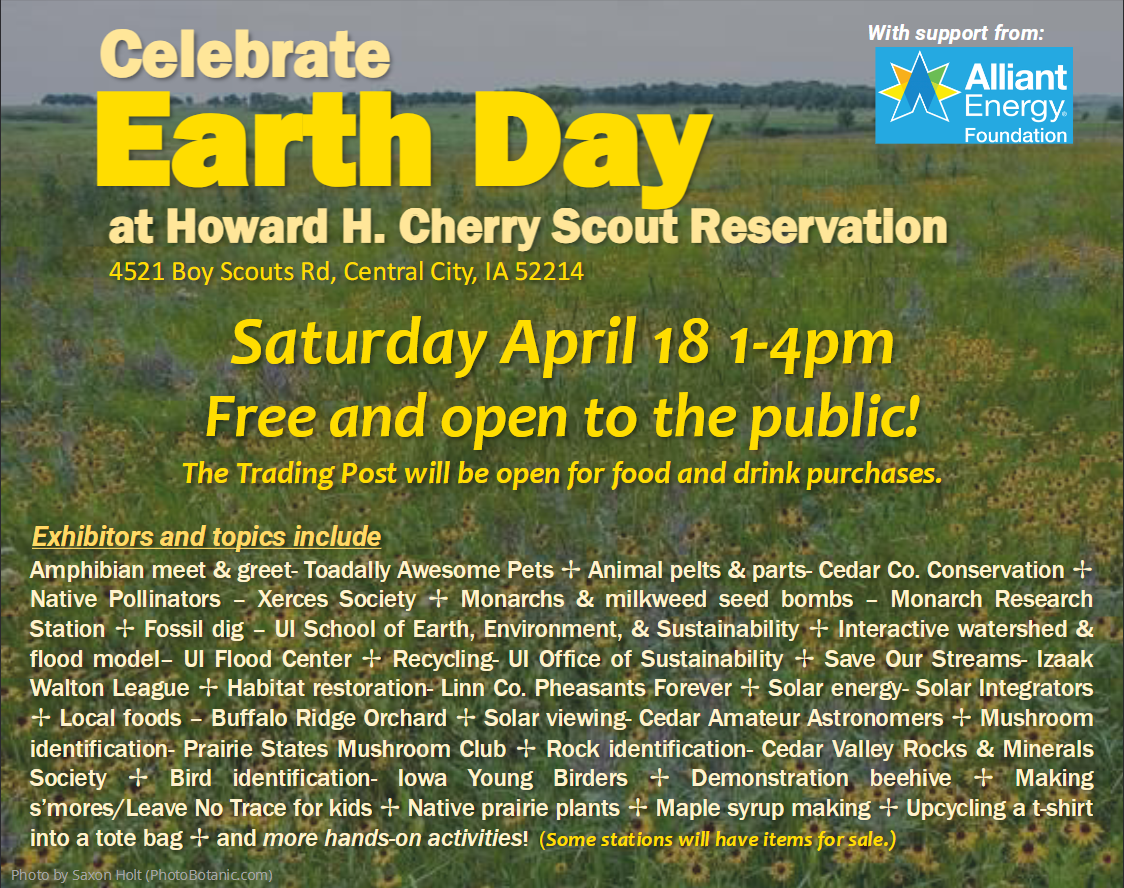 Back to All Events Earth Day at Howard H. Cherry Scout Reservation Saturday, April 18, 2026 1:00 PM 4:00 PM Howard H. Cherry Scout Reservation 4521 Boy Scouts Road Central City, IA, 52214 United States (map) Google Calendar ICS We will be at the Howard H. Cherry Scout Reservation for Earth Day! We will be tabling and leading mini forays into the surrounding forest from 1-4pm. Come see us, and make sure to check out all the other awesome participating organizations too!